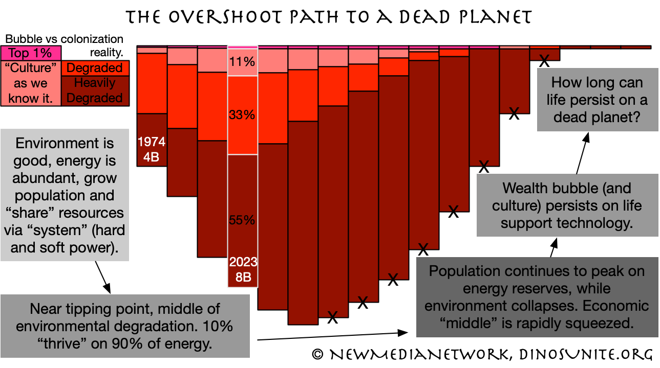 The core realization and call-to-action is that today's society, despite celebrity glamour on tiktok and TV, and the wealth/waste available within dominant colonial cultures, is that society has Already Failed,... and will continue to pretend otherwise, while oil and weaponry exists to exploit (what little is left) of the global commons. As observed at Weltmuseum, Vienna, "Science Fiction(s)" exhibit 2023: "The end of the world will not take place exclusively in the future." We researched the economic reality, and indeed, we stand over the edge of a collosal catastophe, already felt by the vast majority of the global population, and also within the corridors and cubicles of the so-called 'successful'. But what's the alternative?!?! #DinosUnite!